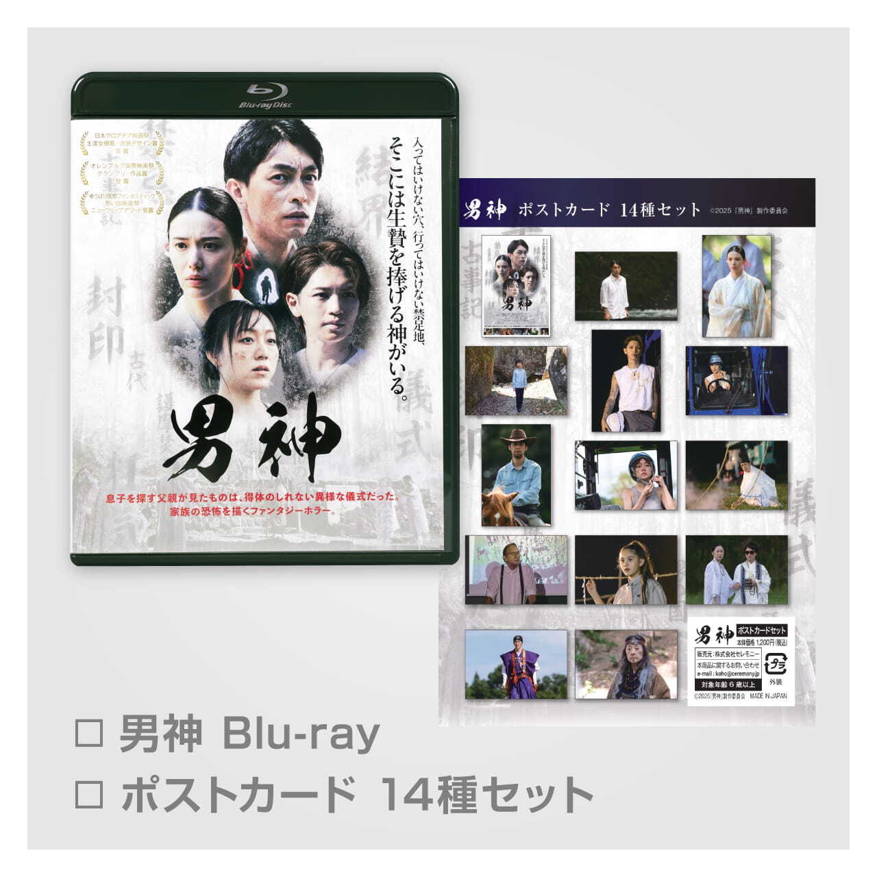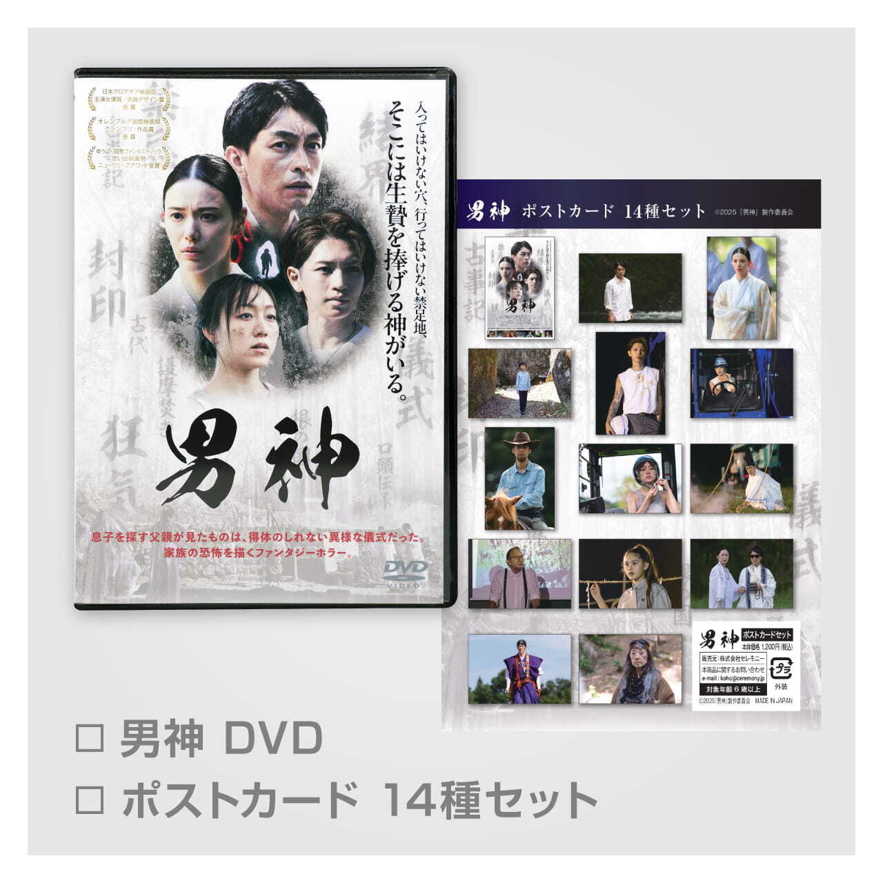 □DVD ¥4,400(税込) □ポストカード14種セット〈20%OFF〉 ¥1,200 → ¥960円(税込) 総額:¥5,360(税込) 品番:CEOD-0001 制作年度:2025年 収録時間:93分 特典映像:105秒 映像:カラー 音声:ドルビーデジタル5.1chサラウンド(本編のみ) 言語:日本語 字幕:英語(本編のみ) ディスク枚数:1枚 備考:※商品の仕様については変更になる場合があります。 <特典映像> ・予告15秒 ・予告30秒 ・予告60秒 <セット品> ・ポストカード14種セット 内容:1セット(14種類) サイズ:約 14 × 10 cm 対象年齢:6歳以上 発売元:2025『男神』 制作委員会 販売元:株式会社 セレモニー